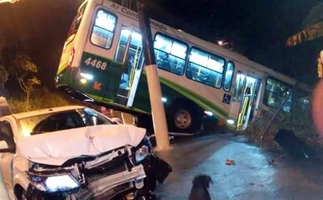 Ônibus sofre acidente e fica pendurado em uma ribanceira; Colisão não deixa feridos graves