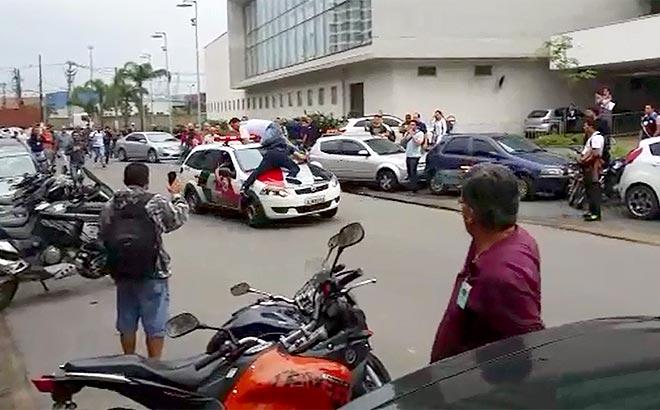 Sindicalista sobem em carro da PM durante protesto em frente à Petrobras