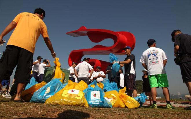 Marinheiros do Japão realizam limpeza simbólica da praia em Santos