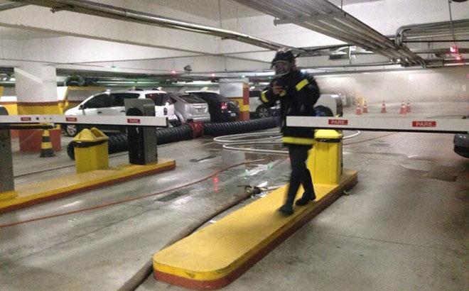 Veículo pega fogo em estacionamento ao lado de shopping e bombeiros isolam a área