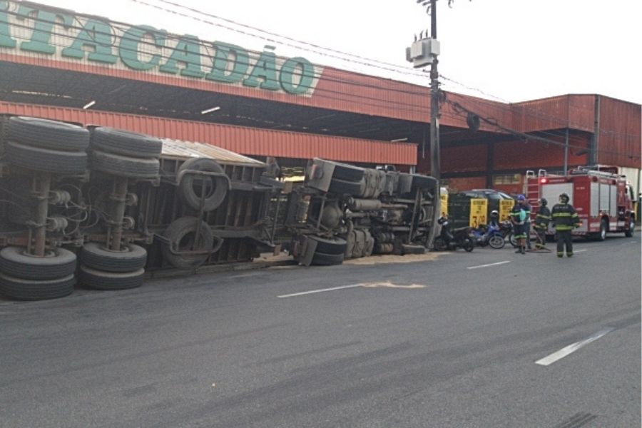 Um motorista perdeu o controle e acabou tombando um caminhão, na tarde deste sábado (26), enquanto trafegava pela Zona Noroeste de Santos.