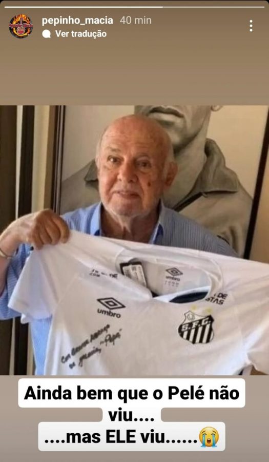 Parceiro de ataque de Pelé, Pepe, o Canhão da Vila não postou nada nas redes sociais, mas seu filho, Pepinho Macia publicou uma foto do pai segurando uma camisa do Santos e escreveu: “Ainda bem que Pelé não viu… mas ELE viu…”