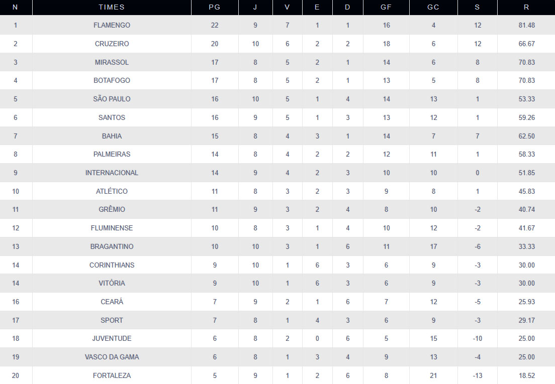 O clube praiano soma 16 pontos em nove partidas – o clássico contra o Palmeiras, válido pela 13ª rodada, foi adiado pela CBF atendendo a um pedido da diretoria alviverde. Com cinco vitórias, um empate e três derrotas, a equipe alvinegra possui 59,26% de aproveitamento neste período. Os dados são do Departamento de Matemática da UFMG (veja abaixo).