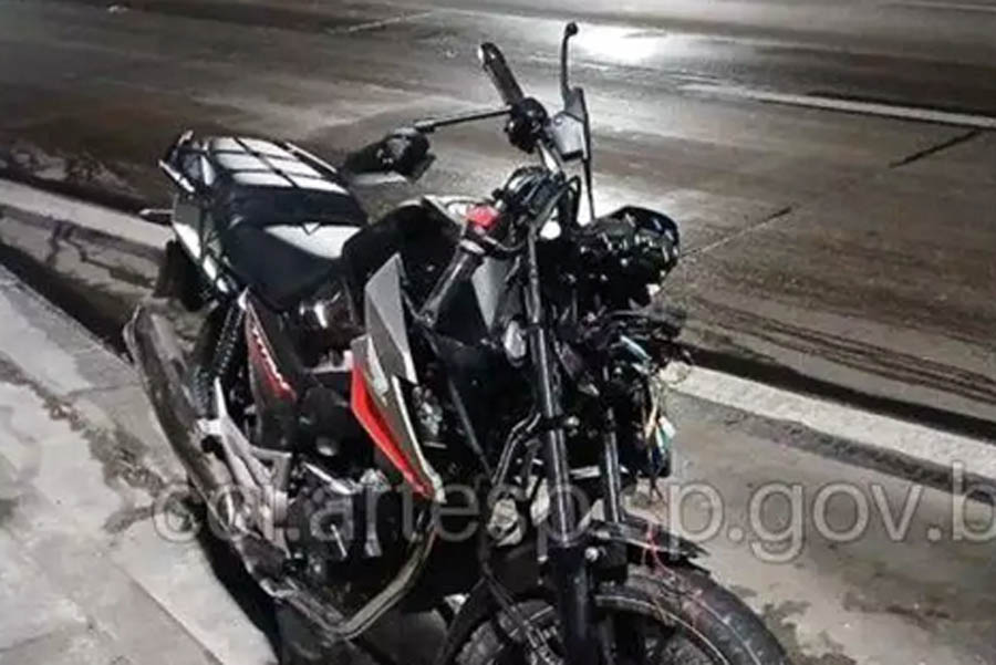 Motociclista fica ferida após colisão com ônibus e moto fica sob o coletivo em São Vicente