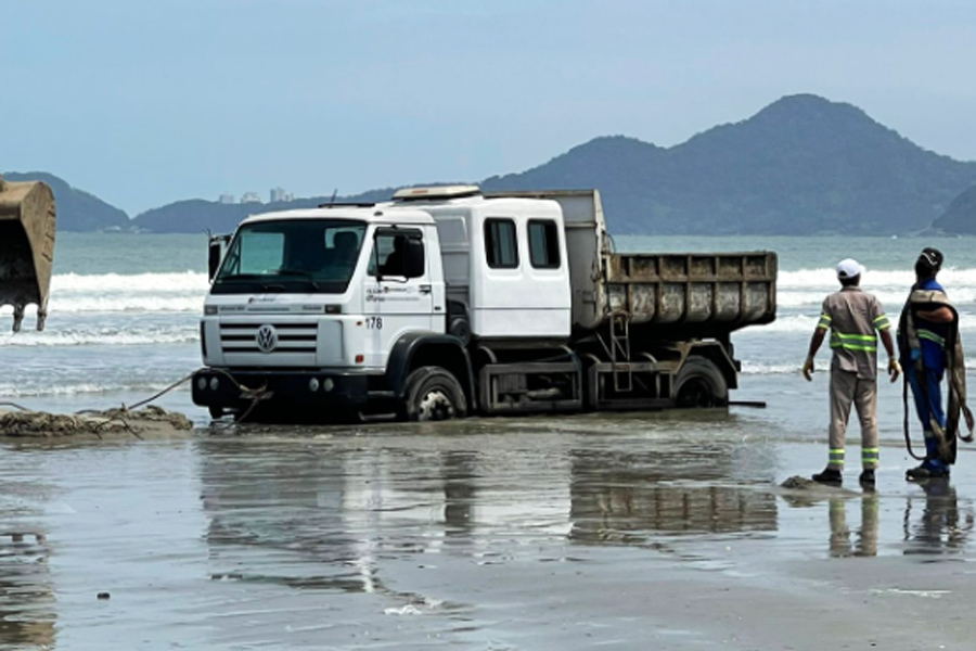 Um caminhão de limpeza da Prodesan (Empresa de Progresso e Desenvolvimento de Santos) atolou na beira do mar, na altura da praia do canal 4, na manhã desta sexta-feira (24), em Santos.
