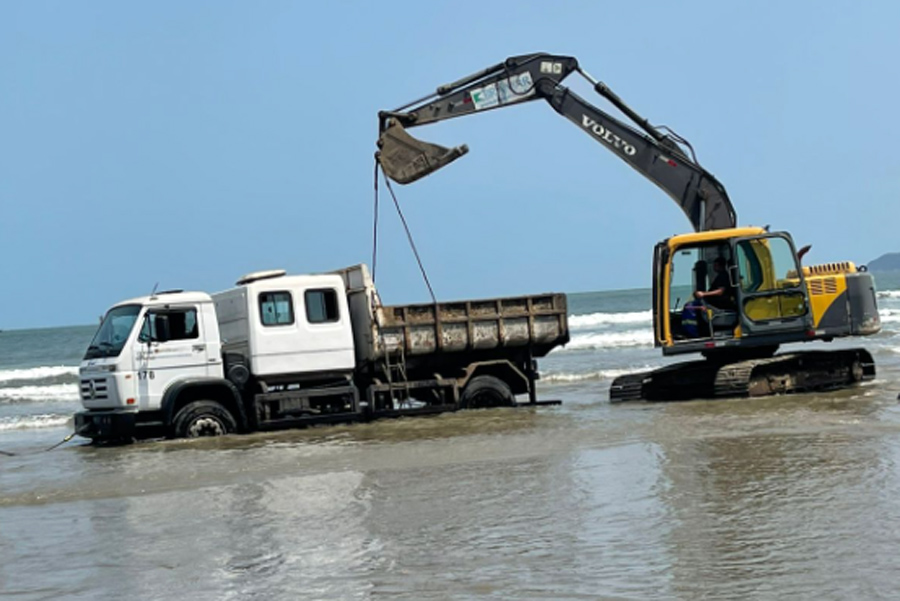 Equipes da Prefeitura foram acionadas para tentar remover o caminhão do local. As equipes esperaram a maré baixar e o caminhão foi retirado da areia por volta das 19h10.