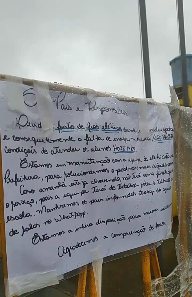 No portão da escola, os responsáveis encontraram um recado (foto abaixo), dizendo que devido aos furtos dos fios de energia, não havia condições de atender os alunos. O recado também dizia que caso estivesse chovendo, as aulas desta quinta-feira (15) também seriam suspensas para que o serviço fosse finalizado.