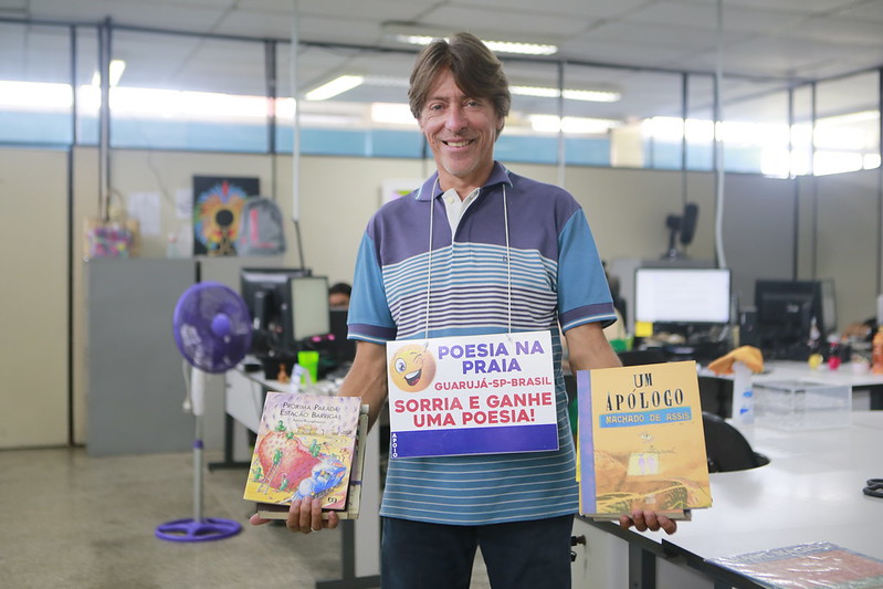 O mediador de leitura de Guarujá, Fábio Rogério, de 59 anos, chegou à marca simbólica de mil livros distribuídos em troca de um sorriso. Desde setembro do ano passado, ele está na Orla da Praia da Enseada todo o domingo pela manhã, na altura do número 3.035 (esquina com a Rua Veraneio), da Avenida Miguel Stefano, oferecendo literatura.