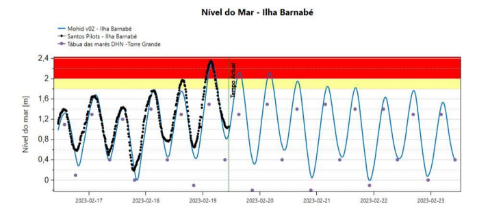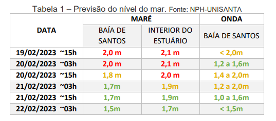 Com relação ao nível do mar, a maré poderá ultrapassar 2,0m na Baía de Santos e 2,1m no interior do estuário, com picos na tarde de domingo (às 15h) e na madrugada de segunda-feira (às 03h), representando aumento de 80cm em relação à tábua de marés (Tabela 1, Figuras 1, 3 e 4)..