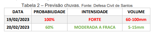 Com relação a meteorologia, a Defesa Civil de Santos informa a previsão de chuva de forma persistente entre hoje (19/02) e segunda-feira (20/02), com longa duração e intensidade forte, o que mantém condições para grande volume de precipitação ao todo. Além disso, a passagem do sistema causará intensificação dos ventos costeiros e risco de rajadas intensas em alguns períodos.