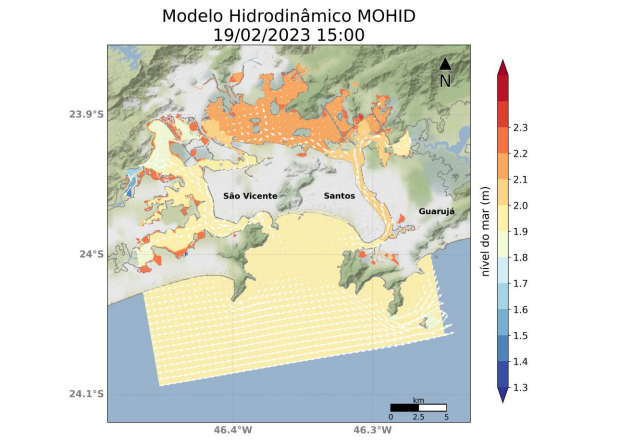 Cabe ressaltar que essas informações são baseadas em previsões de modelos numéricos, podendo sofrer alterações ao longo do tempo. Os pesquisadores do NPHUnisanta e da Defesa Civil de Santos recomendam o acompanhamento das previsões oceanográficas e meteorológicas e das condições do mar nas próximas horas.