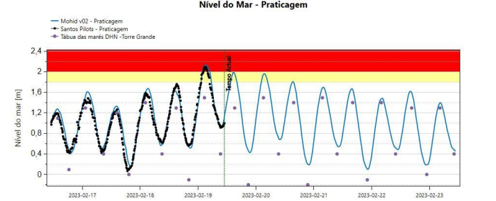 Praticagem de São Paulo em preto e a previsão da tábua de marés (pontos). Os níveis de