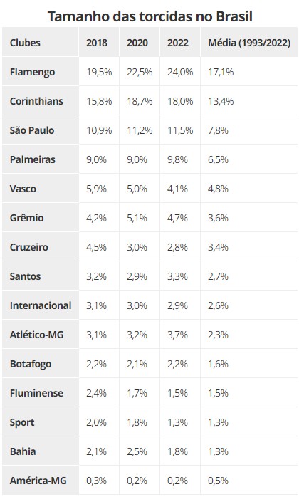 Confira a tabela das 15 maiores torcidas do Brasil (em %)