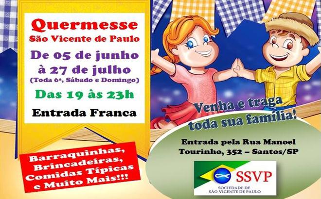 SANTOS – A Sociedade São Vicente de Paulo realiza quermesse toda as sextas-feiras, sábados e domingos, até o dia 27 de julho. A entrada é pela Rua Manoel Tourinho, 352. O evento, com brincadeiras e comidas típicas, tem o intuíto de arrecadar parte do décimo terceiro salário dos funcionários e fundo para as obras assistenciais. A quermesse começa a partir das 19 e vai até às 23 horas.