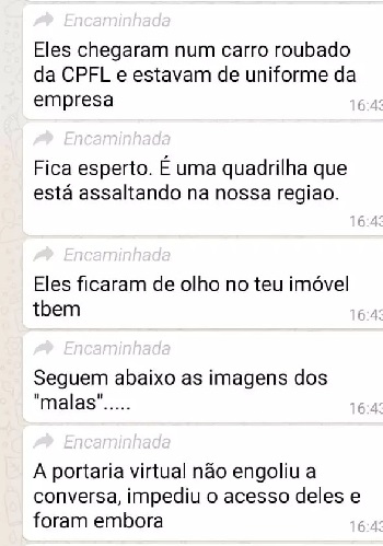 Sem saber que foram filmados, os trabalhadores foram avisados por colegas três dias depois que um vídeo circulava pelo WhatsApp desde a véspera, ao menos. Na gravação, os eletricistas foram citados como “bandidos uniformizados com roupas da CPFL”. Outras postagens alertaram para as imagens dos “malas” e disseram que eles integram “quadrilha que está assaltando na nossa região”.
