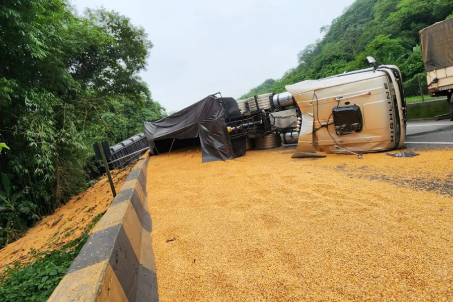 Segundo a Agência de Transportes do Estado de São Paulo (Artesp), uma carreta bitrem tombou no início desta tarde, no km 260 da Cônego, na altura de Cubatão, na pista sentido Guarujá. O acidente causou o derramamento de farelo de milho pela pista e no acostamento da rodovia.