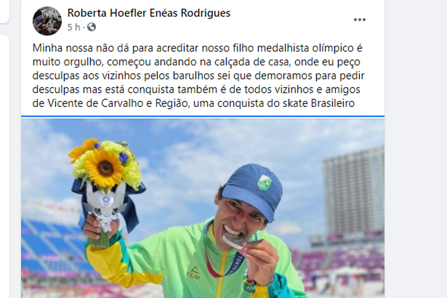 “Minha nossa, não dá para acreditar, nosso filho medalhista olímpico. É muito orgulho”, disse o pai do skatista, que nasceu em Itanhaém e foi criado em Guarujá.