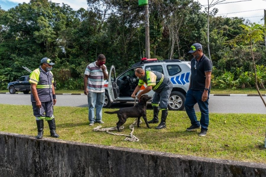 Cachorro cai dentro de canal em Bertioga e é resgatado por agentes de trânsito