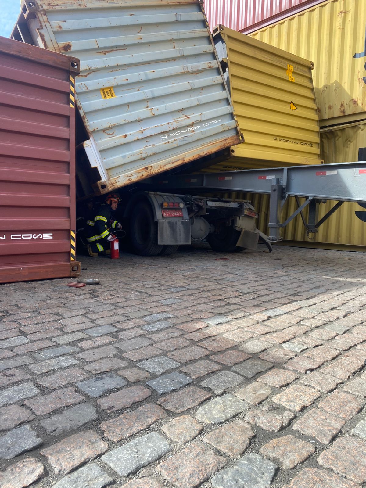 Equipes do Corpo de Bombeiros no local informaram a queda de seis contêineres devido aos fortes ventos. Os bombeiros realizaram os procedimentos de extração da vítima que encontrava-se dentro da boleia do caminhão. O local foi deixado em segurança aos cuidados da polícia científica e policiamento de área.