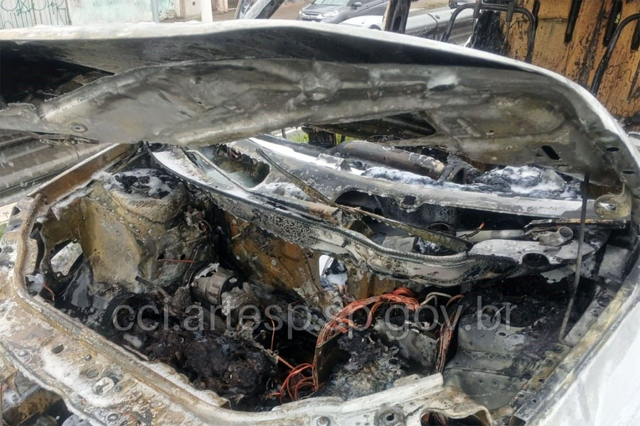Carro fica destruído após pegar fogo na Via Expressa Sul
