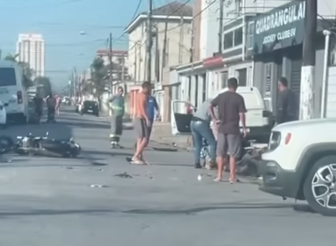Motociclista fica ferida após colisão com ônibus e moto fica sob o coletivo em São Vicente