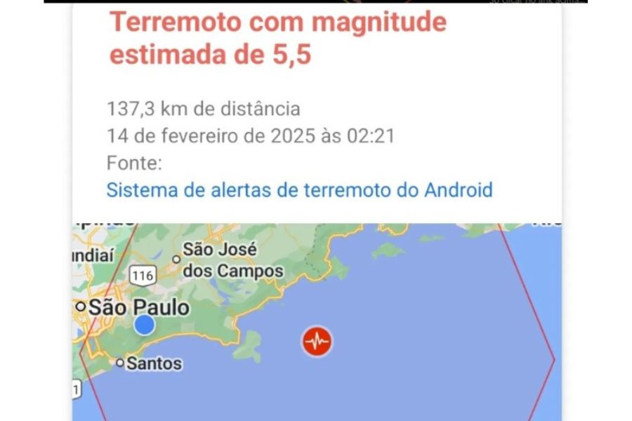 No aviso recebido por meio do sistema de alertas de terremoto do Android, a notificação mostrou possíveis tremores, com magnitudes de 4,4 na região de Ubatuba e 5,5 na Baixada Santista.